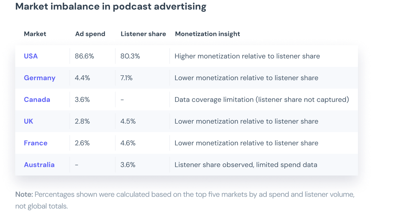 These are not just statistical imbalances. For advertisers, they are signals that audience demand is present, while competition for podcast budgets may still be less intense than in the U.S.